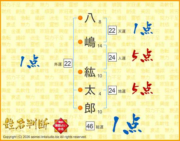八(8画)嶋(14画) 紘(10画)太(4画)郎(10画)