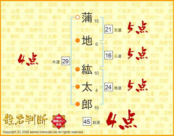 蒲(15画)地(6画) 紘(10画)太(4画)郎(10画)