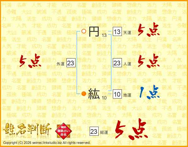 生活面を象徴する運勢です。外部から受ける影響力を表し、結婚運、家庭運や職場、環境への順応性を表します。総運から人運を引いた画数。姓や名が1文字の場合を除く。