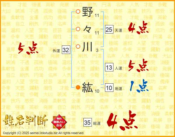 生活面を象徴する運勢です。外部から受ける影響力を表し、結婚運、家庭運や職場、環境への順応性を表します。総運から人運を引いた画数。姓や名が1文字の場合を除く。