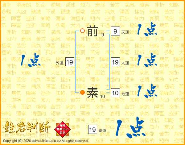 生活面を象徴する運勢です。外部から受ける影響力を表し、結婚運、家庭運や職場、環境への順応性を表します。総運から人運を引いた画数。姓や名が1文字の場合を除く。