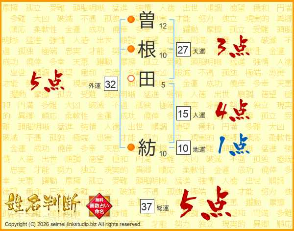 生活面を象徴する運勢です。外部から受ける影響力を表し、結婚運、家庭運や職場、環境への順応性を表します。総運から人運を引いた画数。姓や名が1文字の場合を除く。