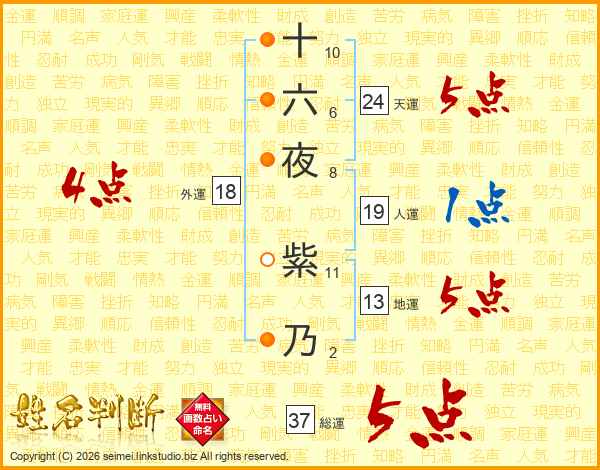 あなたの人生を表す1番重要な運勢です。生涯を通じて影響する総合運となり、主に50歳以降の晩年期に影響を及ぼします。苗字と名前の合計画数。