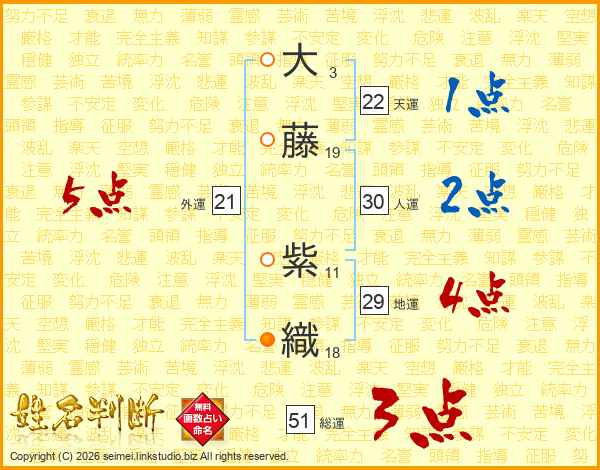 あなたの人生を表す1番重要な運勢です。生涯を通じて影響する総合運となり、主に50歳以降の晩年期に影響を及ぼします。苗字と名前の合計画数。