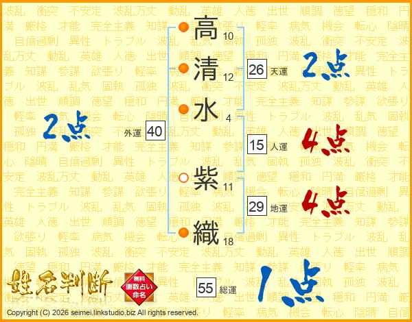 高(10画)清(12画)水(4画) 紫(11画)織(18画)
