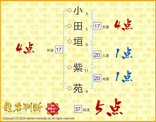 小(3画)田(5画)垣(9画) 紫(11画)苑(9画)
