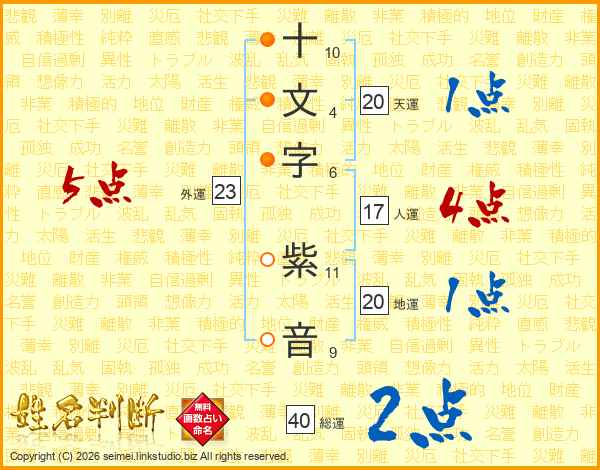 生活面を象徴する運勢です。外部から受ける影響力を表し、結婚運、家庭運や職場、環境への順応性を表します。総運から人運を引いた画数。姓や名が1文字の場合を除く。