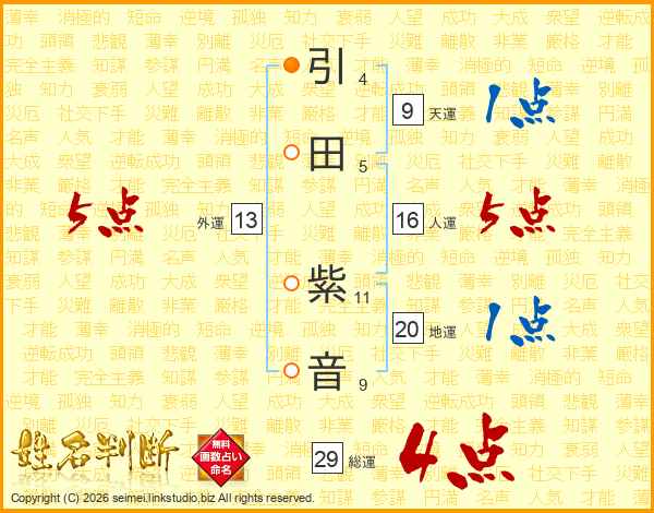 生活面を象徴する運勢です。外部から受ける影響力を表し、結婚運、家庭運や職場、環境への順応性を表します。総運から人運を引いた画数。姓や名が1文字の場合を除く。