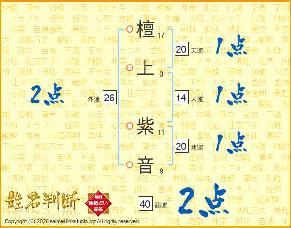 生活面を象徴する運勢です。外部から受ける影響力を表し、結婚運、家庭運や職場、環境への順応性を表します。総運から人運を引いた画数。姓や名が1文字の場合を除く。