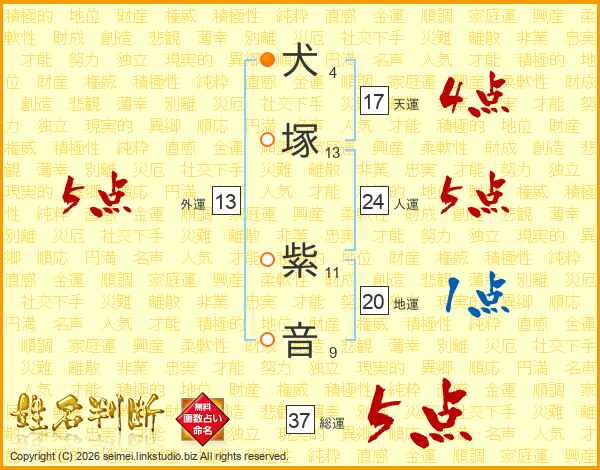 犬塚紫音さんの総運は37画の5点!