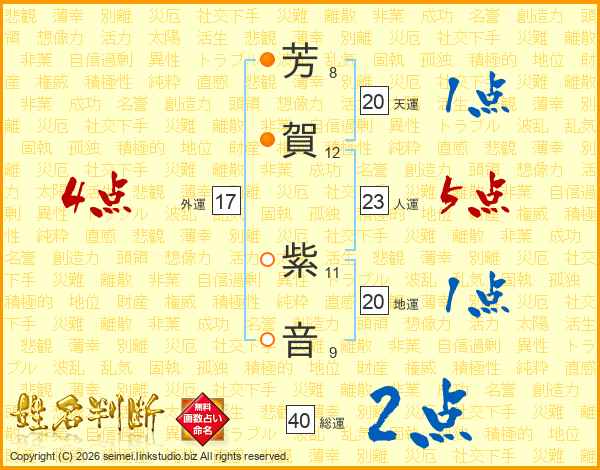 芳(8画)賀(12画) 紫(11画)音(9画)
