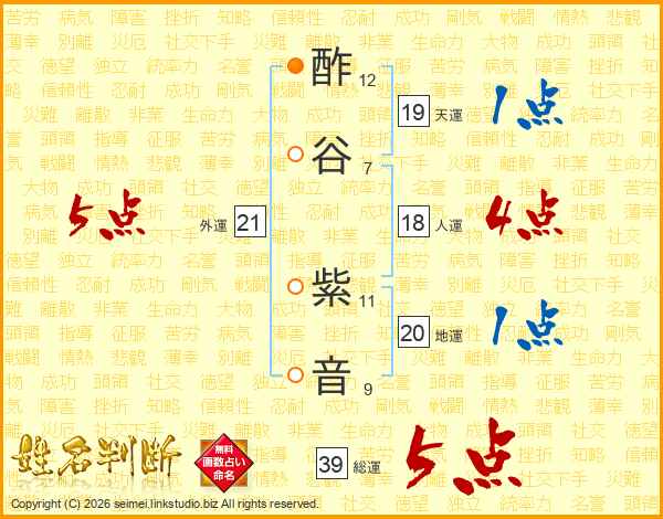 生活面を象徴する運勢です。外部から受ける影響力を表し、結婚運、家庭運や職場、環境への順応性を表します。総運から人運を引いた画数。姓や名が1文字の場合を除く。