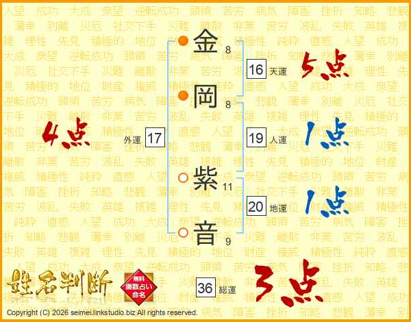 金(8画)岡(8画) 紫(11画)音(9画)