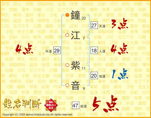 鐘(20画)江(7画) 紫(11画)音(9画)