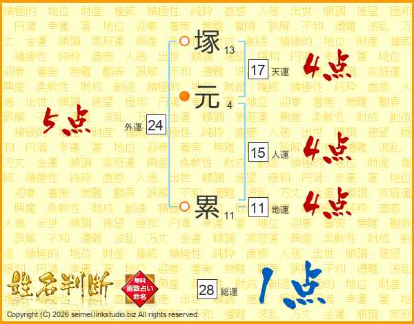 あなたの人生を表す1番重要な運勢です。生涯を通じて影響する総合運となり、主に50歳以降の晩年期に影響を及ぼします。苗字と名前の合計画数。