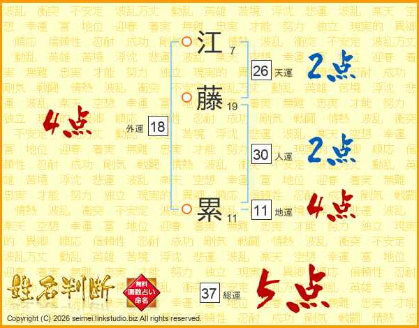 あなたの人生を表す1番重要な運勢です。生涯を通じて影響する総合運となり、主に50歳以降の晩年期に影響を及ぼします。苗字と名前の合計画数。
