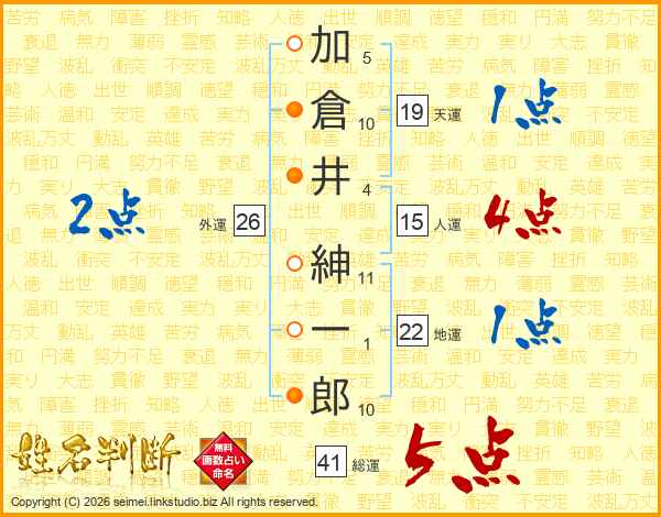 加(5画)倉(10画)井(4画) 紳(11画)一(1画)郎(10画)