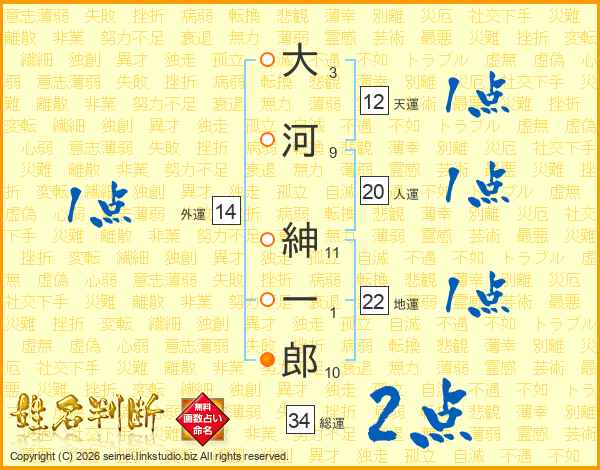 大(3画)河(9画) 紳(11画)一(1画)郎(10画)