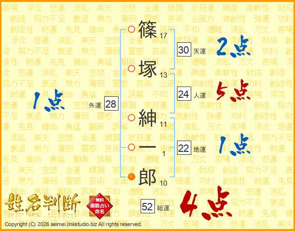 篠(17画)塚(13画) 紳(11画)一(1画)郎(10画)