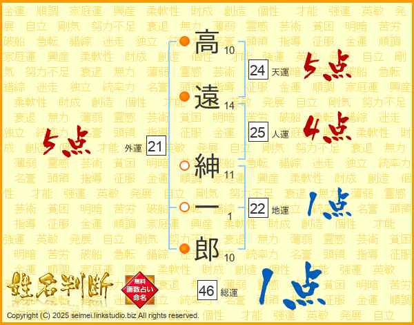 高(10画)遠(14画) 紳(11画)一(1画)郎(10画)