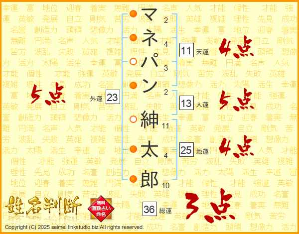 マ(2画)ネ(4画)パ(3画)ン(2画) 紳(11画)太(4画)郎(10画)