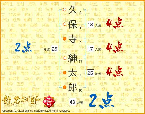久(3画)保(9画)寺(6画) 紳(11画)太(4画)郎(10画)