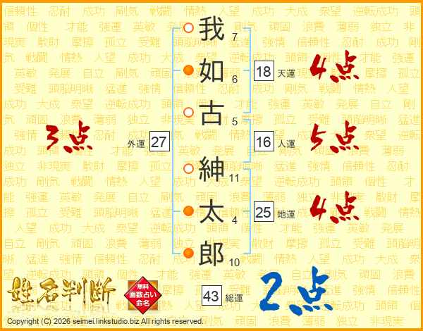 我(7画)如(6画)古(5画) 紳(11画)太(4画)郎(10画)