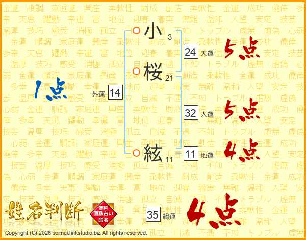 生活面を象徴する運勢です。外部から受ける影響力を表し、結婚運、家庭運や職場、環境への順応性を表します。総運から人運を引いた画数。姓や名が1文字の場合を除く。