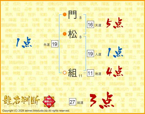 あなたの人生を表す1番重要な運勢です。生涯を通じて影響する総合運となり、主に50歳以降の晩年期に影響を及ぼします。苗字と名前の合計画数。