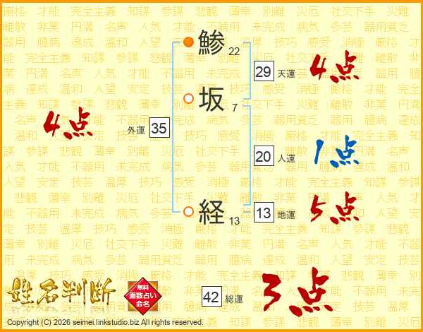 鯵坂経さんの天運は29画の4点!