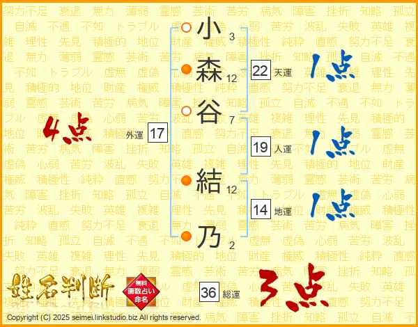 小(3画)森(12画)谷(7画) 結(12画)乃(2画)