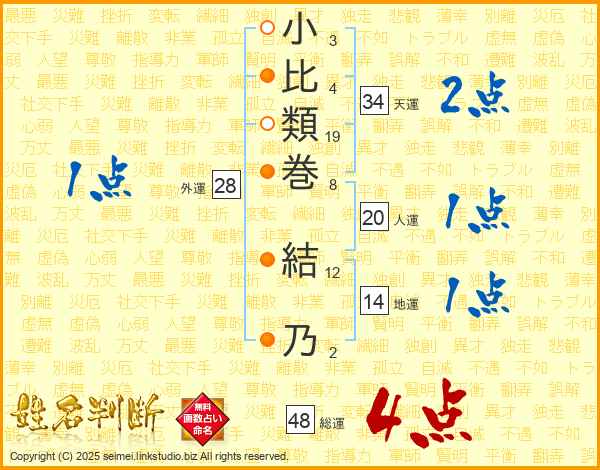 小(3画)比(4画)類(19画)巻(8画) 結(12画)乃(2画)