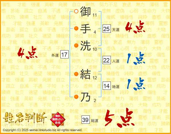 生活面を象徴する運勢です。外部から受ける影響力を表し、結婚運、家庭運や職場、環境への順応性を表します。総運から人運を引いた画数。姓や名が1文字の場合を除く。