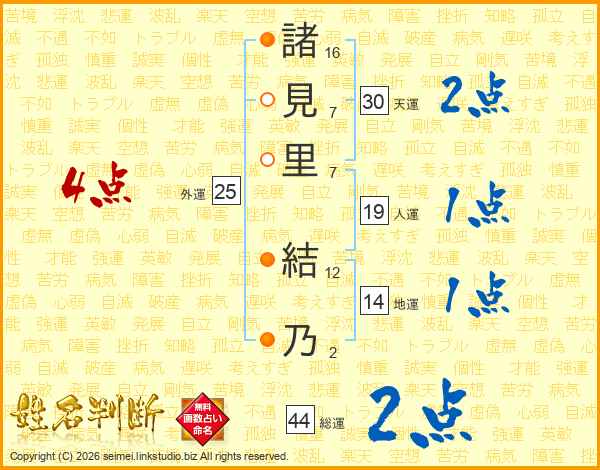 諸(16画)見(7画)里(7画) 結(12画)乃(2画)