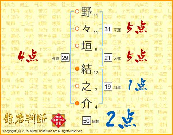 野(11画)々(11画)垣(9画) 結(12画)之(3画)介(4画)
