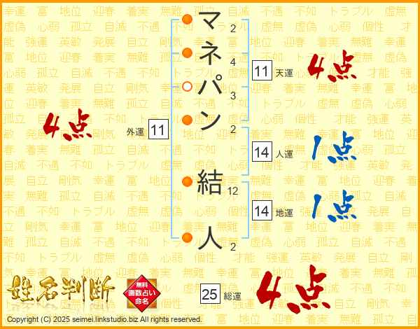 マ(2画)ネ(4画)パ(3画)ン(2画) 結(12画)人(2画)
