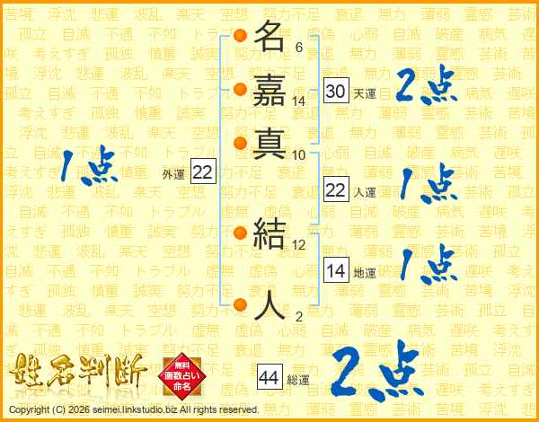 名(6画)嘉(14画)真(10画) 結(12画)人(2画)