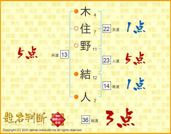 木(4画)住(7画)野(11画) 結(12画)人(2画)