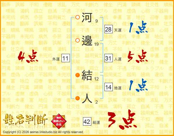 生活面を象徴する運勢です。外部から受ける影響力を表し、結婚運、家庭運や職場、環境への順応性を表します。総運から人運を引いた画数。姓や名が1文字の場合を除く。