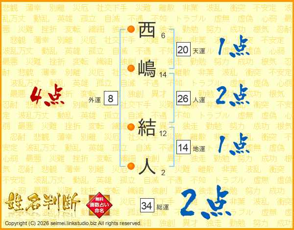 生活面を象徴する運勢です。外部から受ける影響力を表し、結婚運、家庭運や職場、環境への順応性を表します。総運から人運を引いた画数。姓や名が1文字の場合を除く。
