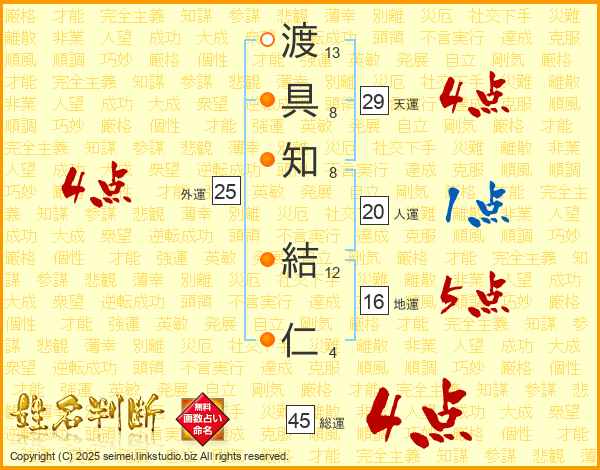 渡(13画)具(8画)知(8画) 結(12画)仁(4画)