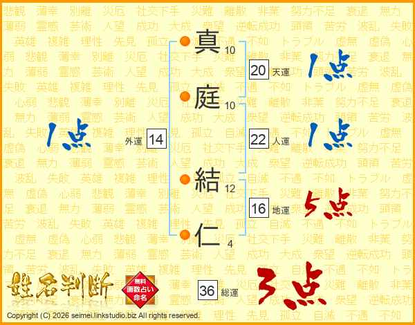 生活面を象徴する運勢です。外部から受ける影響力を表し、結婚運、家庭運や職場、環境への順応性を表します。総運から人運を引いた画数。姓や名が1文字の場合を除く。