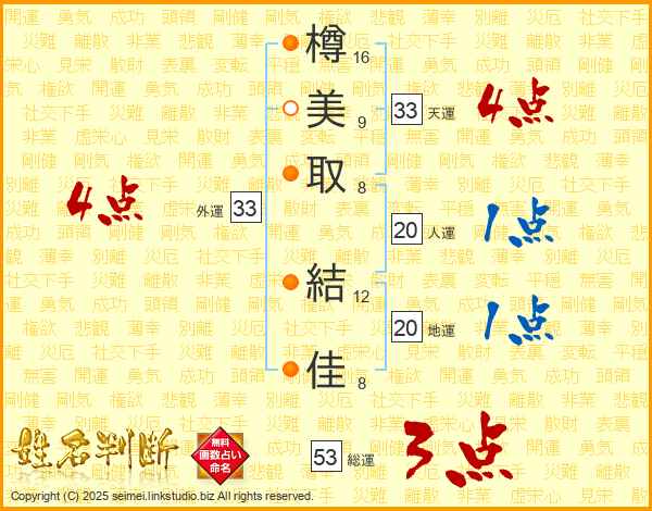 樽(16画)美(9画)取(8画) 結(12画)佳(8画)