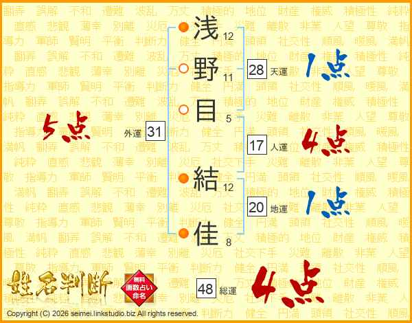 浅(12画)野(11画)目(5画) 結(12画)佳(8画)