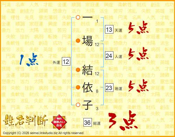 一(1画)場(12画) 結(12画)依(8画)子(3画)