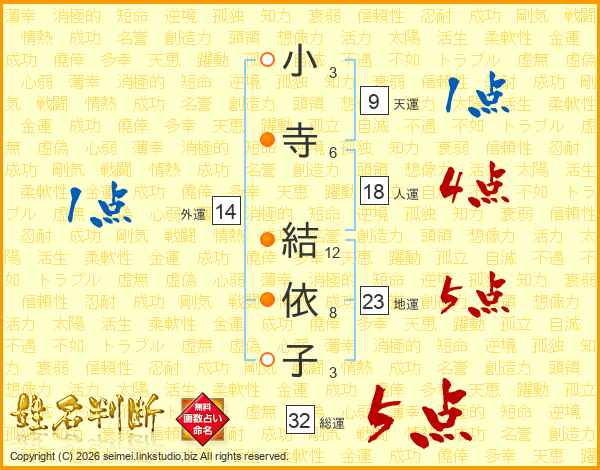 小(3画)寺(6画) 結(12画)依(8画)子(3画)