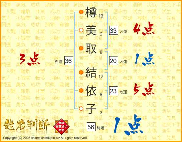 樽(16画)美(9画)取(8画) 結(12画)依(8画)子(3画)