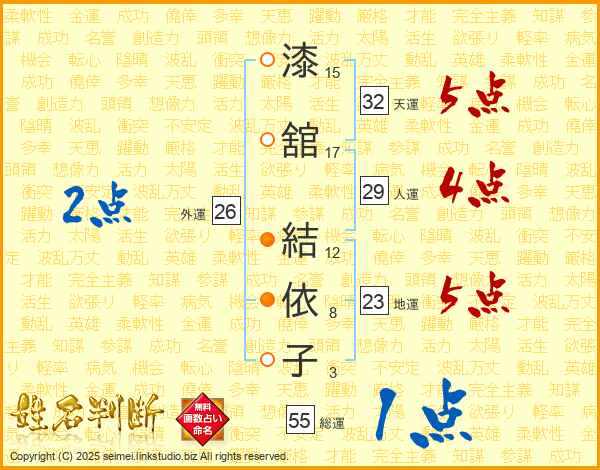 漆(15画)舘(17画) 結(12画)依(8画)子(3画)