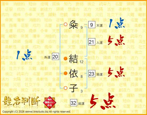 粂(9画) 結(12画)依(8画)子(3画)