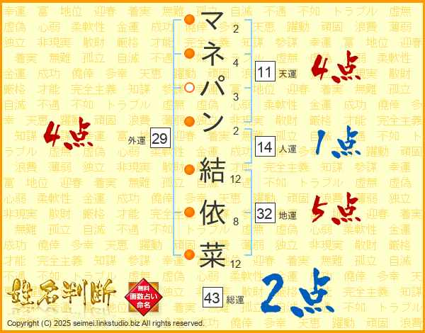 マ(2画)ネ(4画)パ(3画)ン(2画) 結(12画)依(8画)菜(12画)